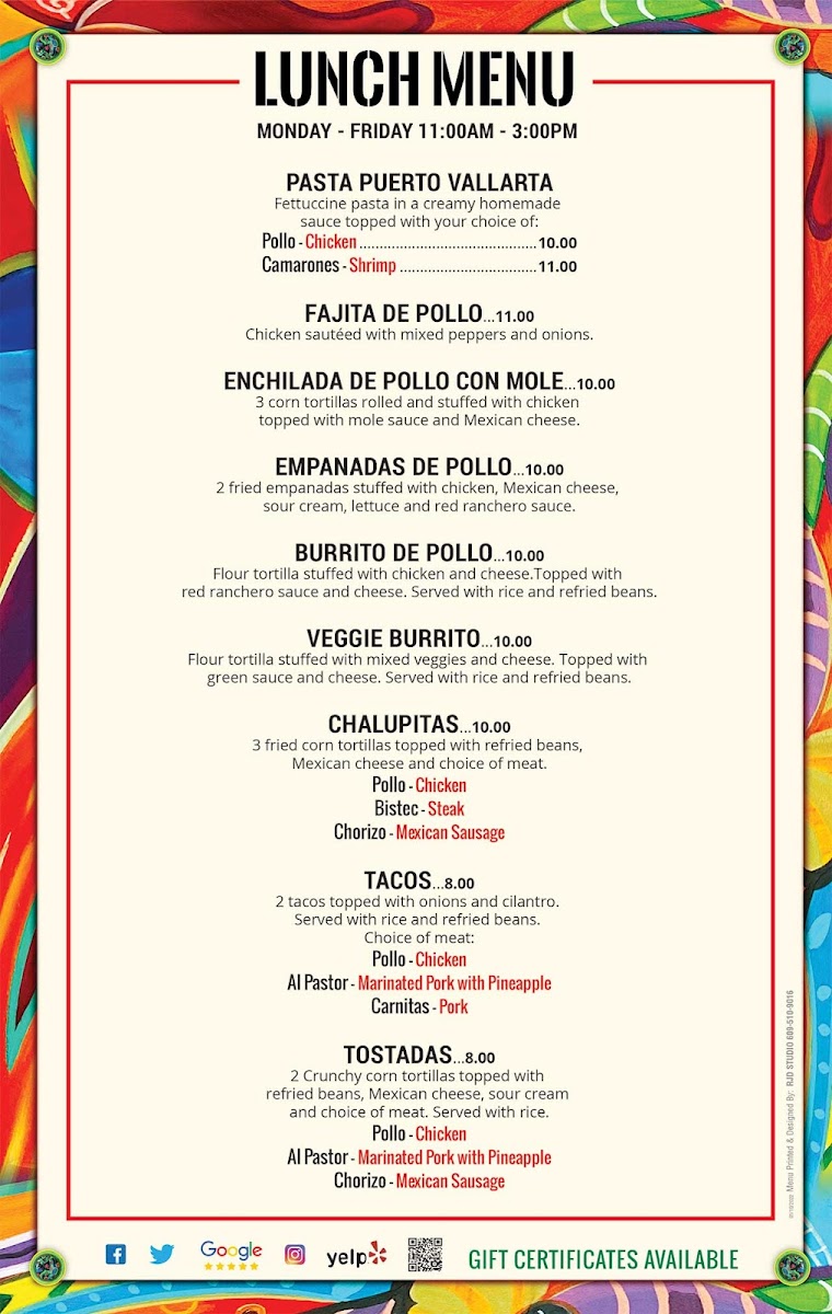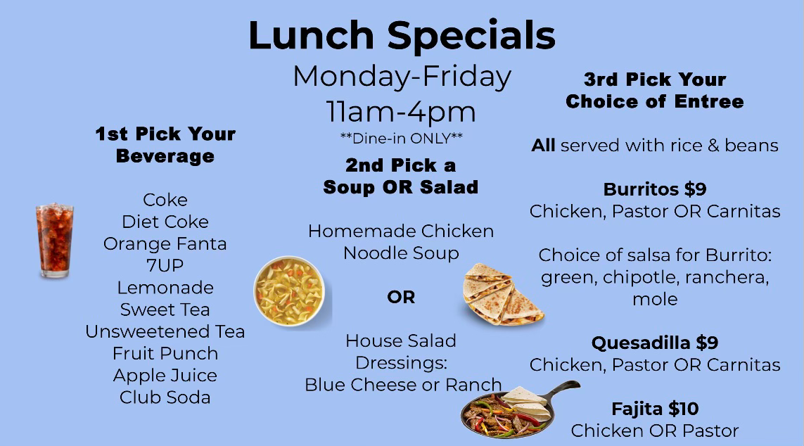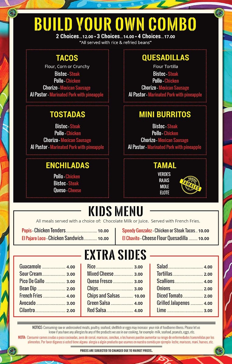 BEANS, LETTUCE, GUACAMOLE, PICO DE GALLO, CHICKEN, PORK, STEAK, QUESO DIP.