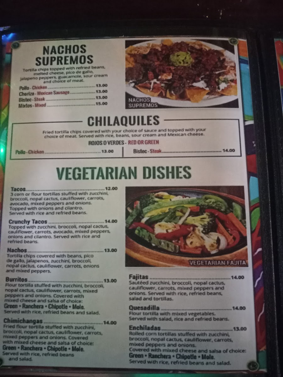 FLOUR TORTILLA STUFFED WITH ZUCCHINI, BROCCOLI, NOPAL CACTUS, CAULIFLOWER, CARROTS, MIXED PEPPERS AND ONIONS. COVERED WITH MIXED CHEESE AND SALSA OF CHOICE: GREEN RANCHERA CHIPOTLE MOLE. SERVED WITH RICE, REFRIED BEANS AND SALAD
