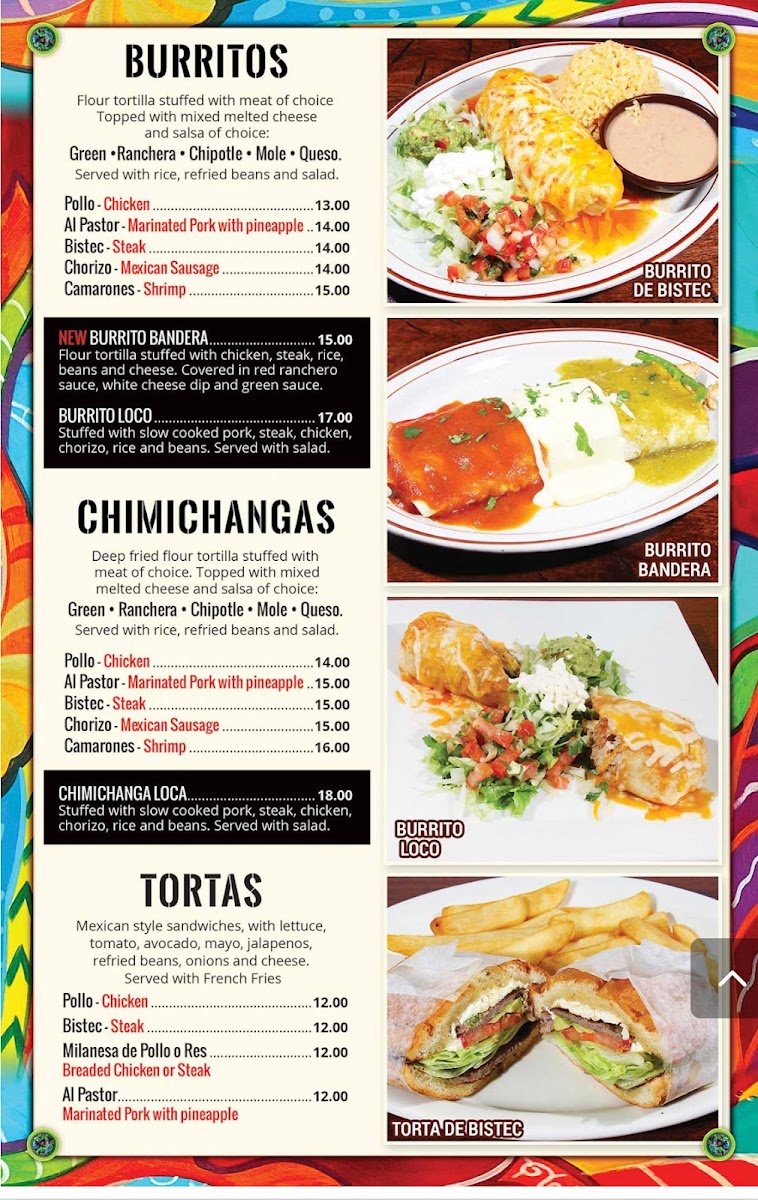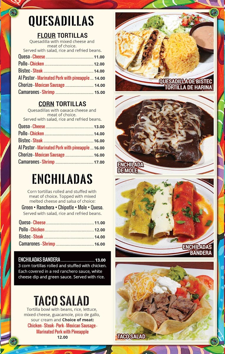 FLOUR TORTILLA STUFFED WITH MEAT OF CHOICE TOPPED WITH MIXED MELTED CHEESE AND SALSA OF CHOICE: GREEN RANCHERA CHIPOTLE MOLE QUESO. SERVED WITH RICE, REFRIED BEANS AND SALAD.