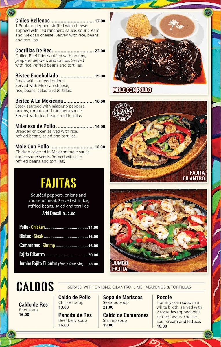 SAUTÉED PEPPERS, ONIONS AND CHOICE OF MEAT. SERVED WITH RICE, REFRIED BEANS, SALAD AND TORTILLAS.